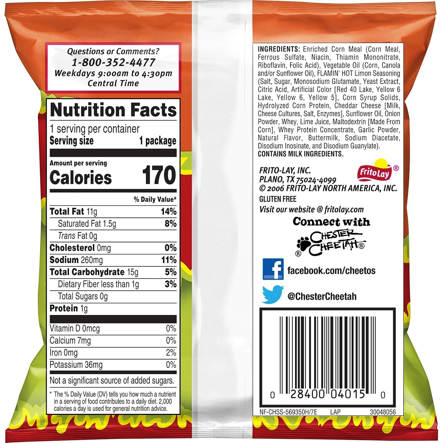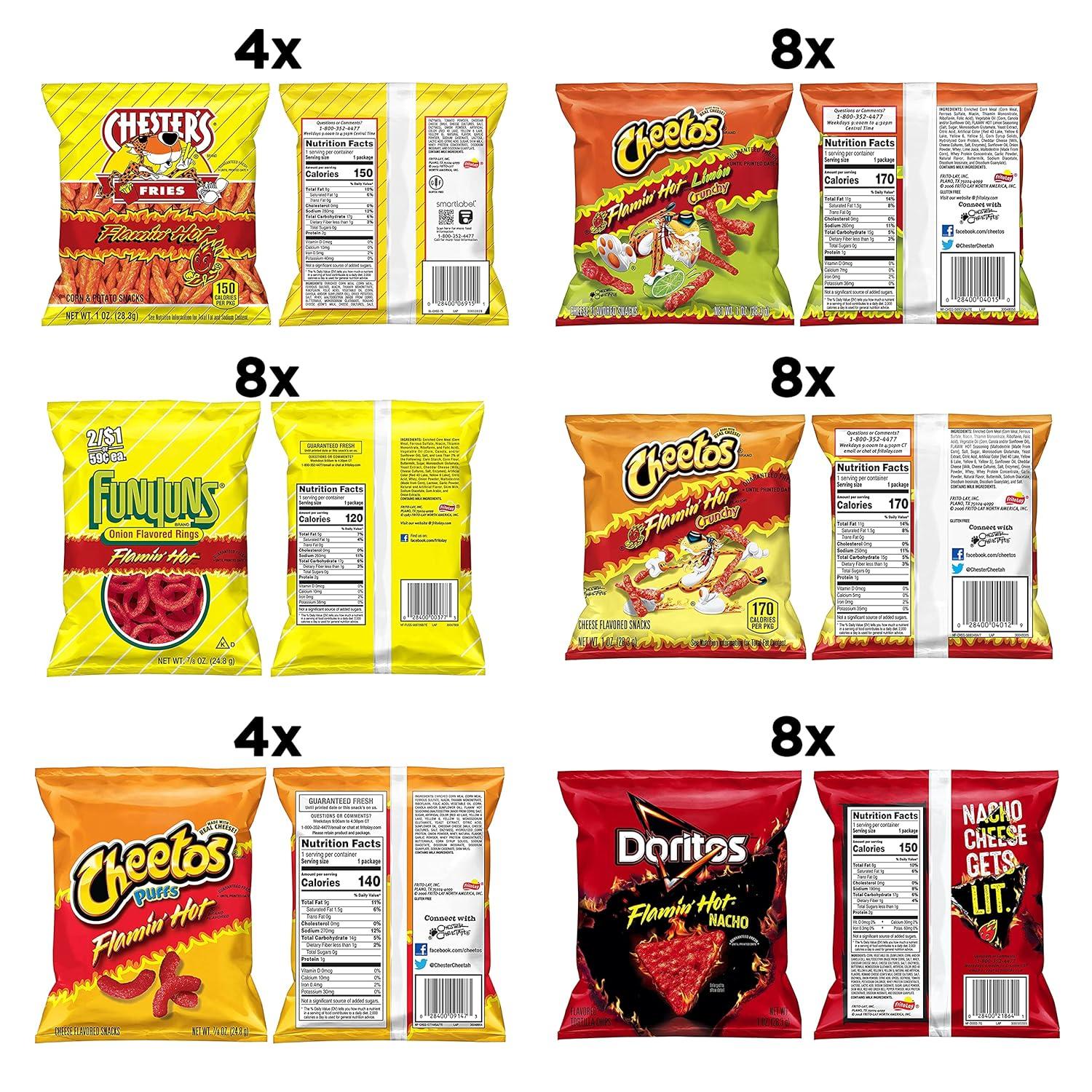 (8) Cheetos crunchy flaming’ hot, (4) Chester’s hot fries, (8) funyuns flaming’ hot, (8) Cheetos crunchy flaming’ hot Limon, (4) Cheetos puffs flaming’ hot, (8) Doritos flaming’ hot nacho